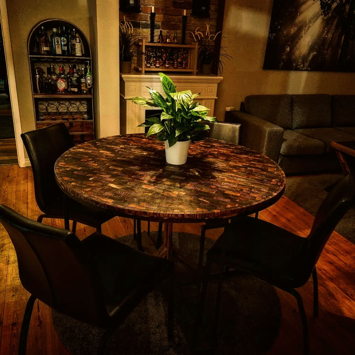 Ett galet projekt som började med ett stort staket i smide. En slags bardisk/köksö med tillhörande pallar. Byggt i furu med en skiva full med vinkorkar ingjutna i epoxy. Väldigt mycket pyssel, men ett roligt projekt.